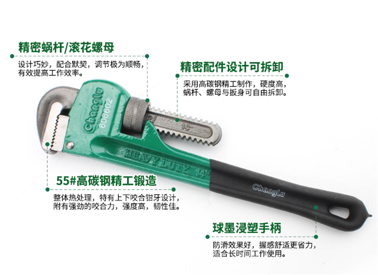美式重型管鉗水管鉗子55#高碳鋼精工鍛造,整體熱處理,特有上下咬合鉗牙設(shè)計,