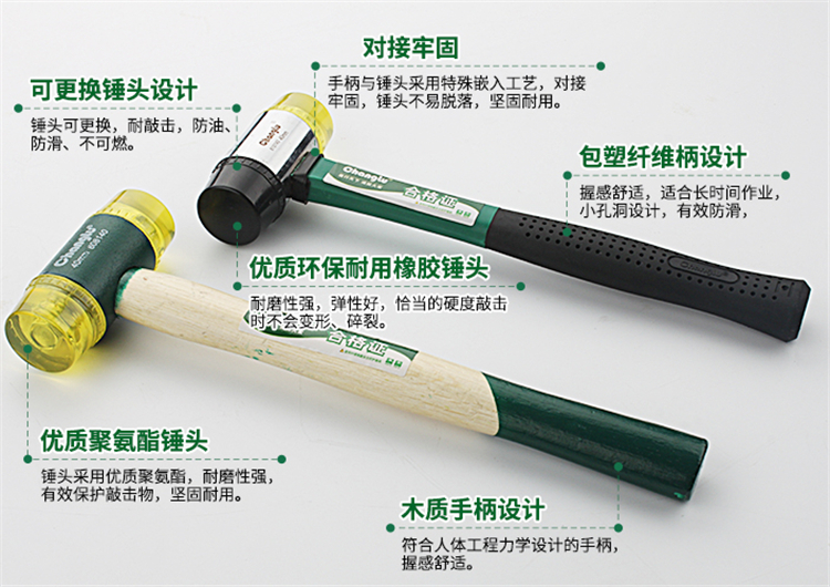 長(zhǎng)鹿橡膠錘可更換鍾頭設(shè)計(jì),耐敲擊,防油、防滑、不可燃。手柄與鍾頭采用特殊嵌