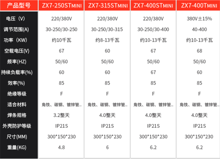 東升電焊機(jī)ZX7-250STMINI/315STMINI/400ST智能雙電壓逆變直流技術(shù)參數(shù)