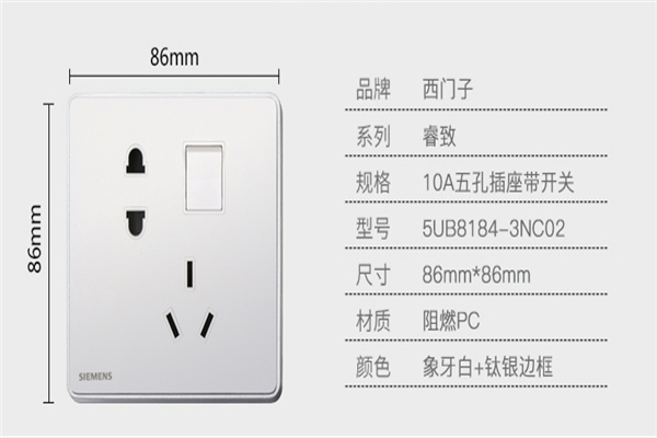 睿致系列86型五孔插座帶開關(guān)商品參數(shù)展示圖