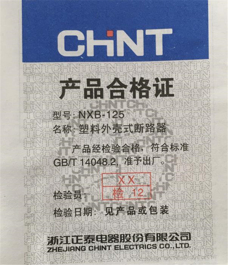 NXB-125塑料外殼式斷路器產(chǎn)品合格證