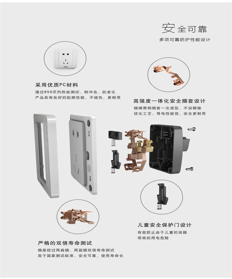 多項(xiàng)可靠防護(hù)性能設(shè)計(jì)采用優(yōu)質(zhì)PC材料通過(guò)850度灼熱絲測(cè)試