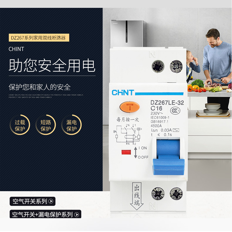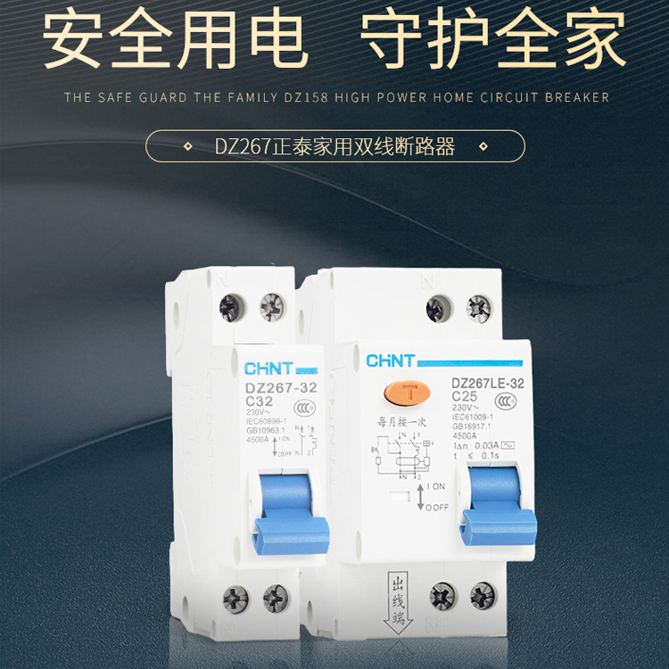 正泰斷路器家用小型空氣開關(guān)雙線斷路器DZ267LE 漏電保護雙進雙出