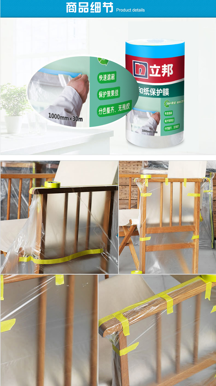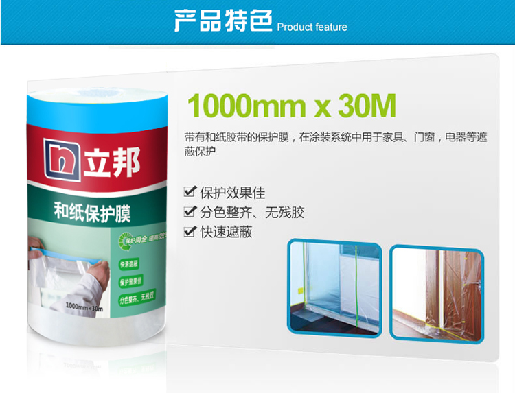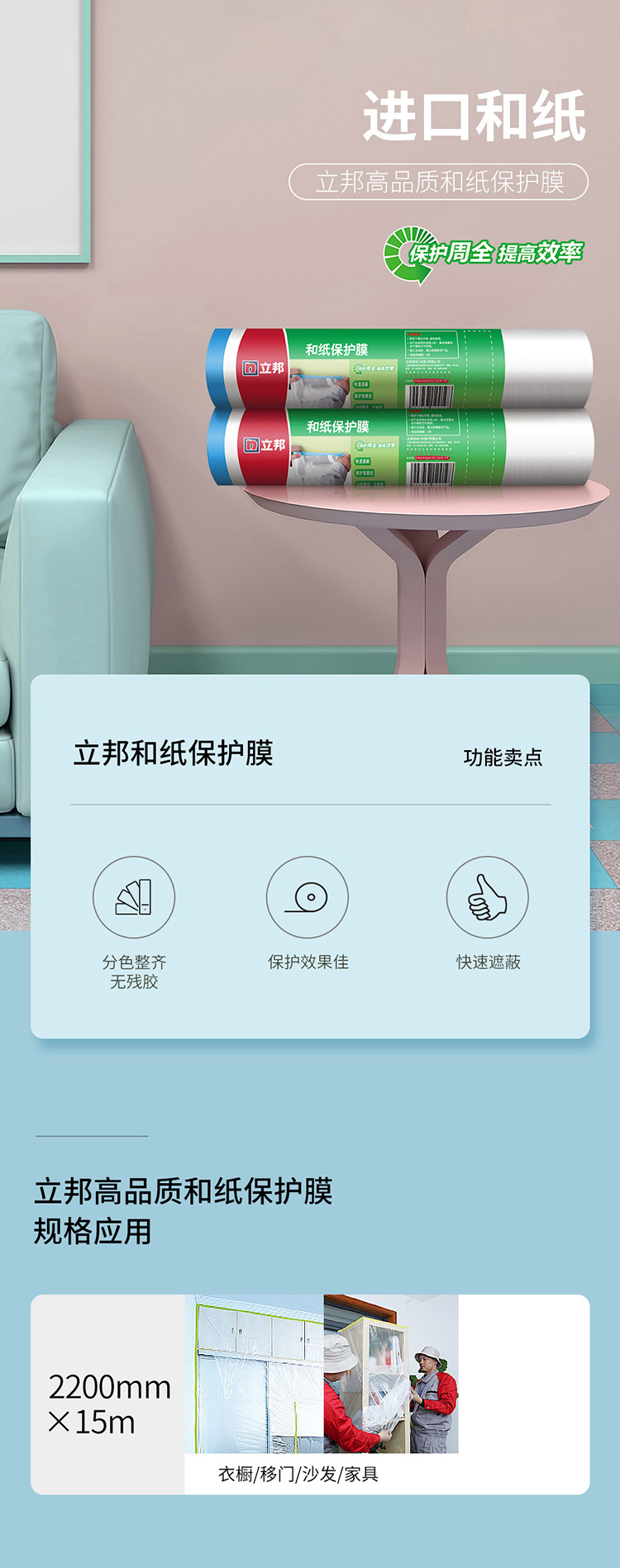 立邦和紙保護(hù)膜油漆噴漆遮蔽膜家居防護(hù)膜:帶有和紙膠帶的保護(hù)膜,在涂裝系統(tǒng)中用于家具、門(mén)窗、電器等遮蔽保護(hù)。