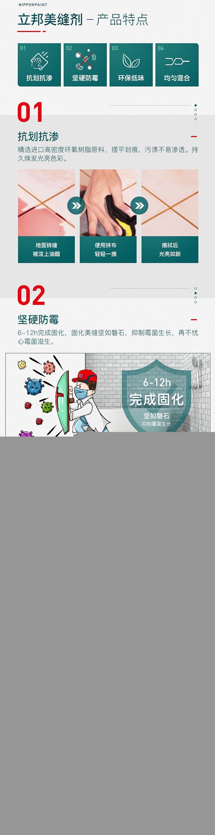 6-12h完成固化,固化美縫堅如磐石,抑制霉菌生長,再不憂心霉菌滋生。
