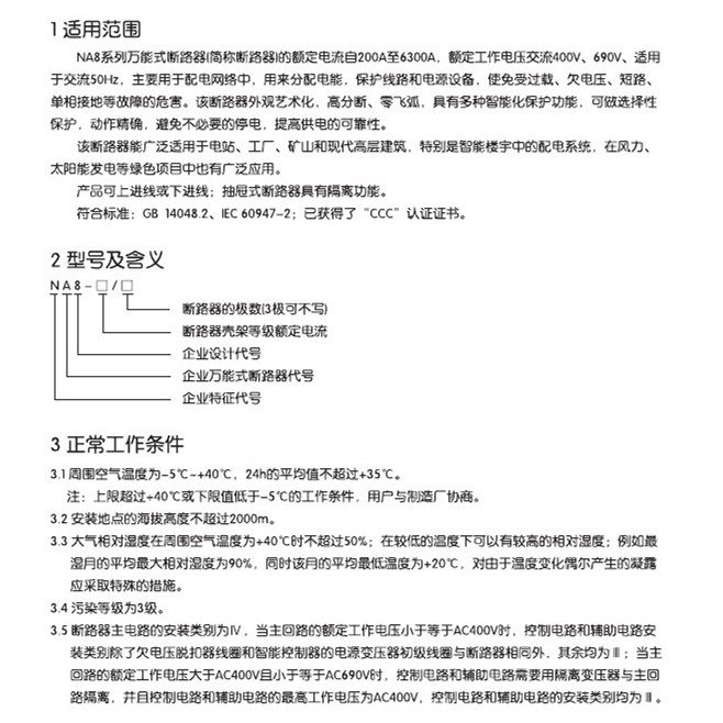 正泰NA8系列萬能式斷路器可上進(jìn)線或下進(jìn)線;抽屜式斷路器具有隔離功能。符合標(biāo)準(zhǔn):GB/T 14048.2、IEC/EN 60947-2。