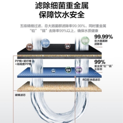 美的智能除菌凈水器五級精細(xì)過濾,濾除細(xì)菌重金屬。