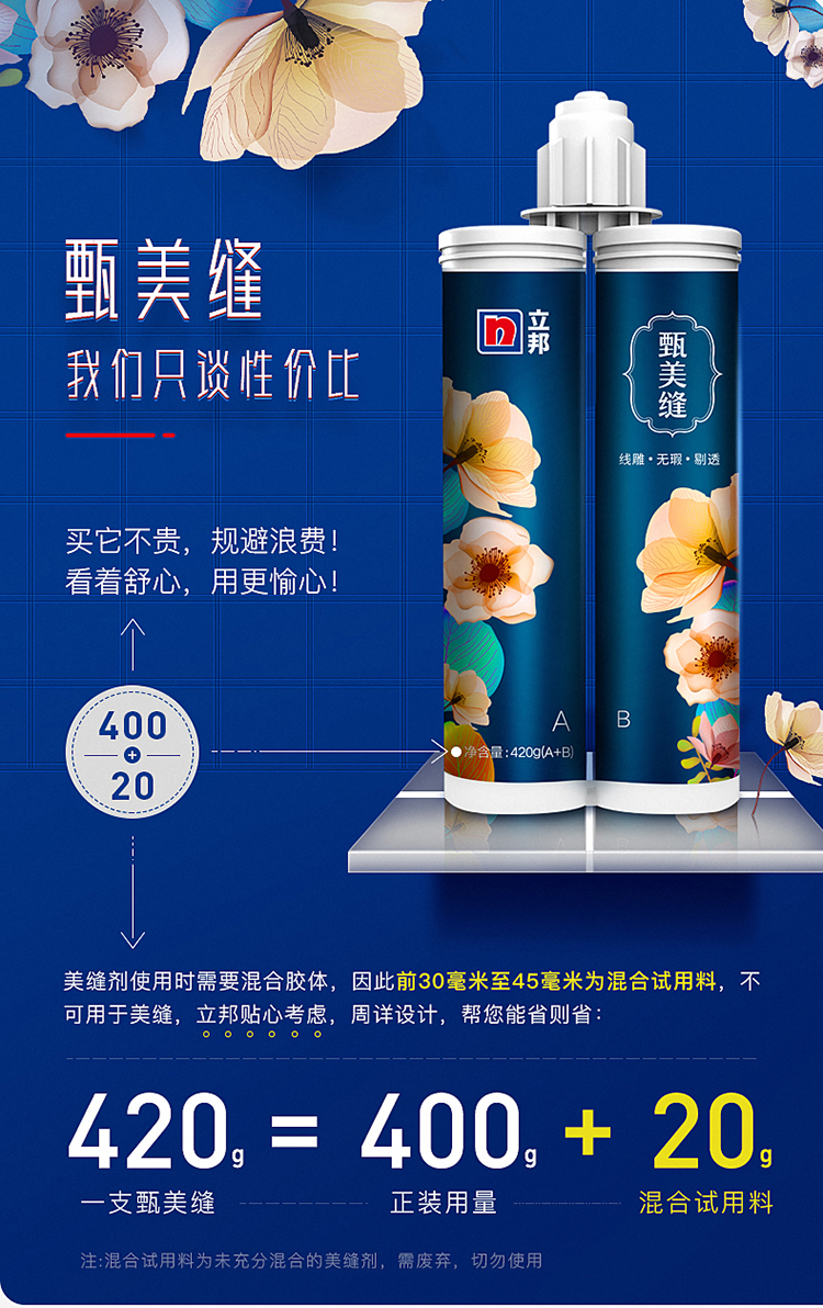 立邦美縫劑瓷磚地磚專用家用防水美縫勾縫填縫施工工具劑膠甄美縫:AB組膠組成粘度差異越小,混合愈加均勻,上磚呈現(xiàn)的效果才會更好!立邦雙組膠體粘度統(tǒng)一,施工方便,帶給您舒適的產(chǎn)品體驗。