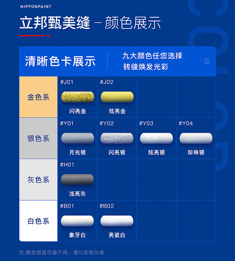 立邦美縫劑瓷磚地磚專用家用防水美縫勾縫填縫施工工具劑膠甄美縫:采用立邦凈味技術(shù),使用高成本環(huán)保原料,施工低味,為居家健康保駕護(hù)航。