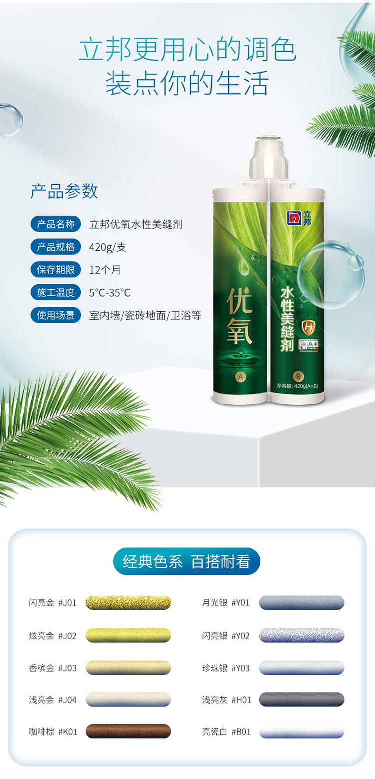 立邦優(yōu)氧水性美縫劑瓷磚地磚專用填縫劑:色彩靚麗,顏值出眾,選用化妝品級無汞鉛珠光色粉,顏色純度更高;產(chǎn)品良好的耐黃變性,能夠有效抵御紫外線照射后的色變,讓家持久靚麗。