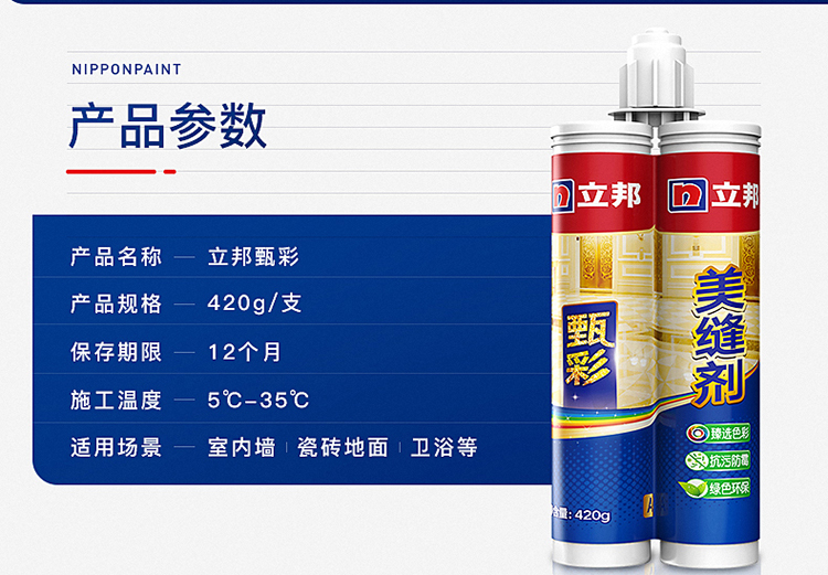 立邦甄彩美縫劑瓷磚地磚專用美縫膠填縫:環(huán)保低味,采用立邦凈味技術(shù),使用高成本環(huán)保原料,施工低味,為居家健康保駕護(hù)航。