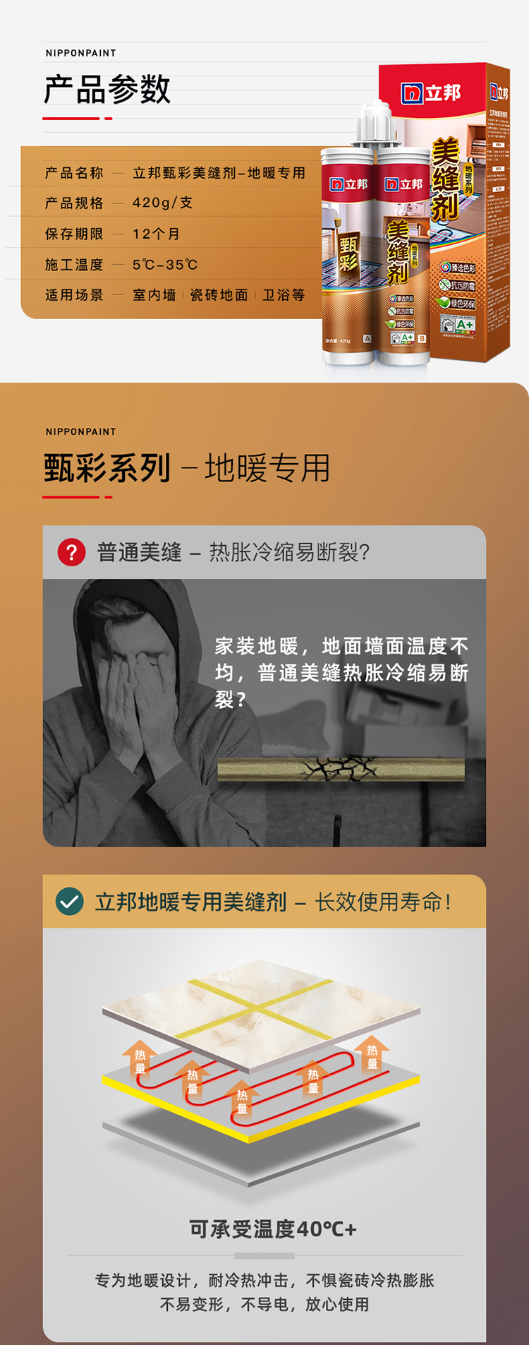 立邦地暖縫美縫劑瓷磚地磚專用美瓷膠美縫膠填縫:堅硬防霉,6-12h完成固化,固化美縫堅如磐石,抑制霉菌生長,再不憂心霉菌滋生。