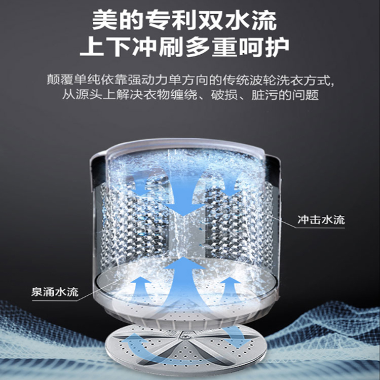 美的全自動(dòng)波輪洗衣機(jī)采用雙水流對(duì)沖技術(shù),防纏繞更護(hù)衣。