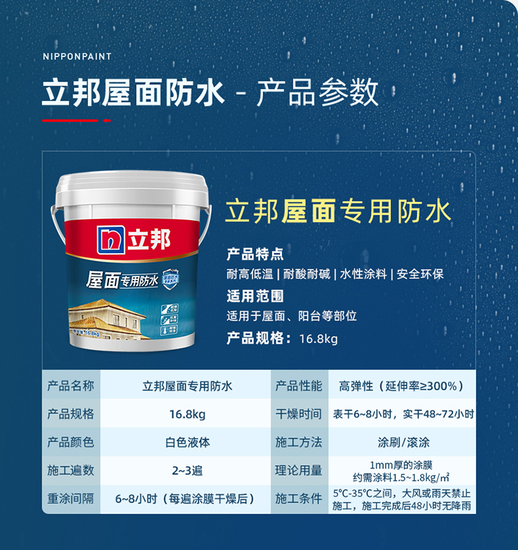 立邦屋面專用防水涂料:延伸率佳,延伸率≥300%,對(duì)基層的收縮、變形和開裂適應(yīng)性強(qiáng)。