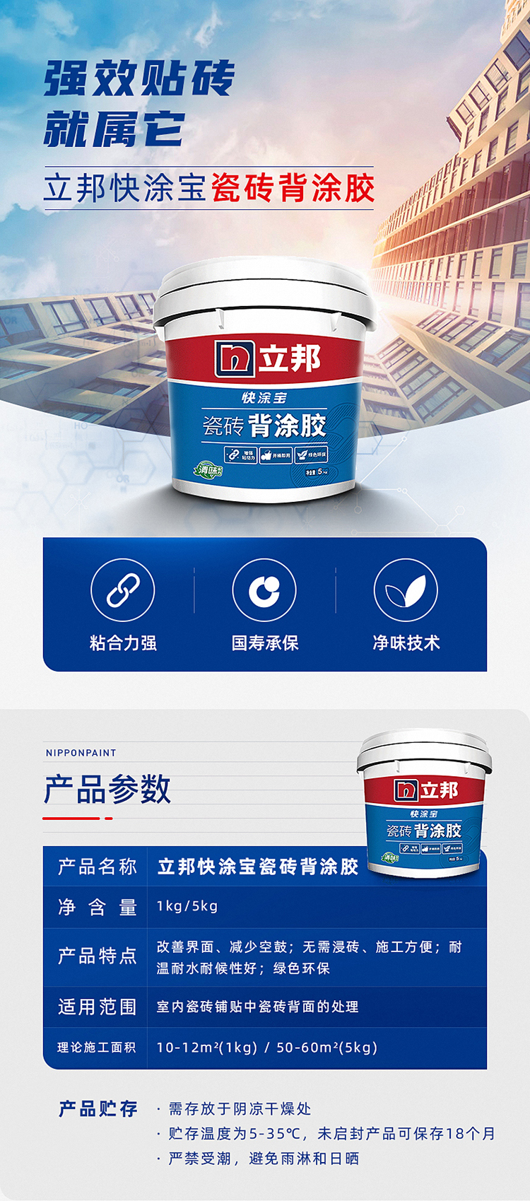 立邦強力瓷磚背涂膠:耐候性好,優(yōu)異的耐熱、耐凍性。高分子聚合物,性能穩(wěn)定,不易受環(huán)境影響。