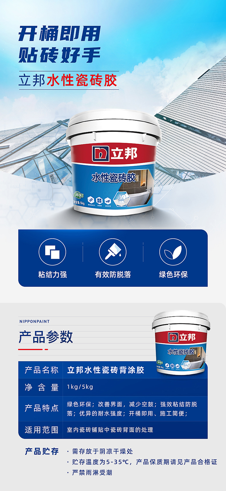 立邦水性瓷磚背涂膠:強效粘結(jié)不掉磚,粘結(jié)強度> 0.5MPa,可與建筑物同壽命。
