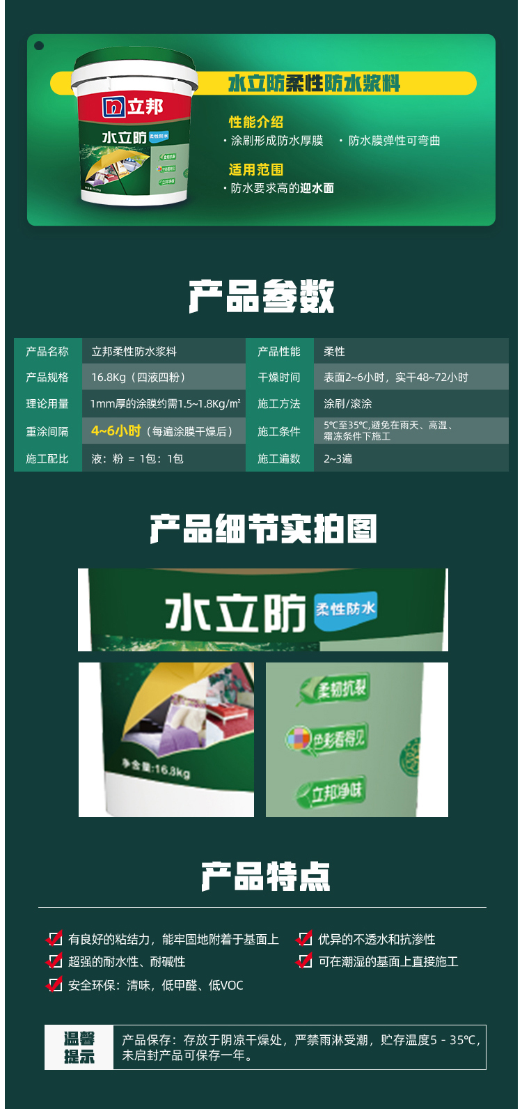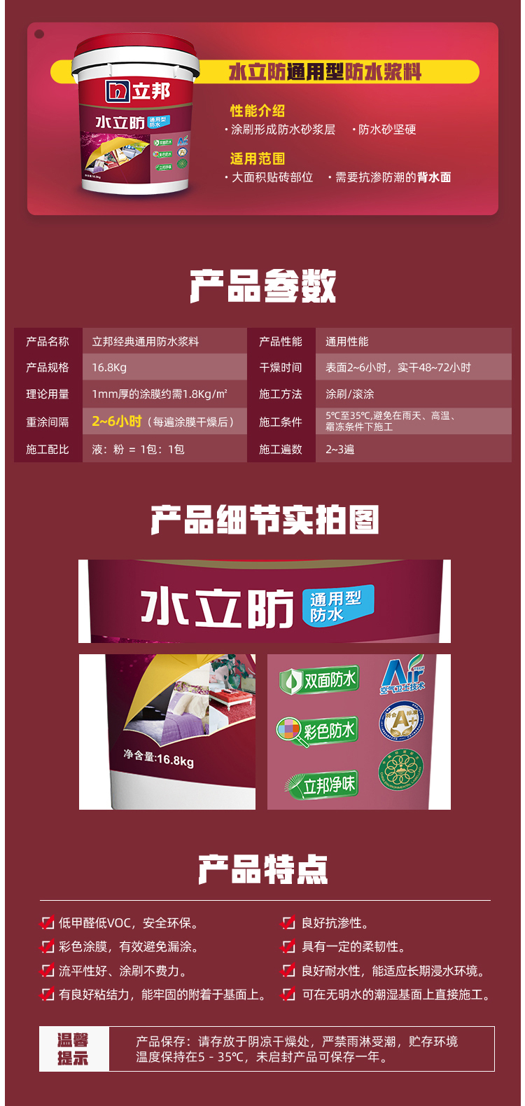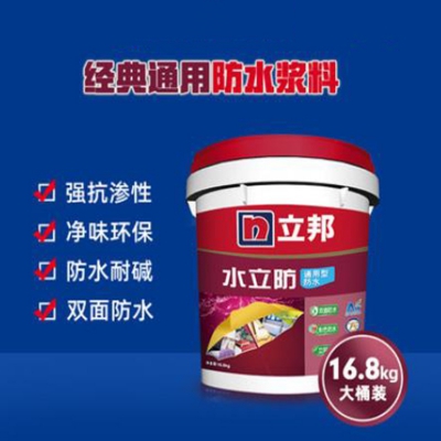立邦經(jīng)典通用防水漿料是一種雙組份水性防水漿料,采用新型環(huán)保乳液作為液料,以特種水泥和多種活性填料組成無機粉料,經(jīng)一定比例配制而成,具有良好的耐水性,耐堿性,粘結(jié)強度高等特性。