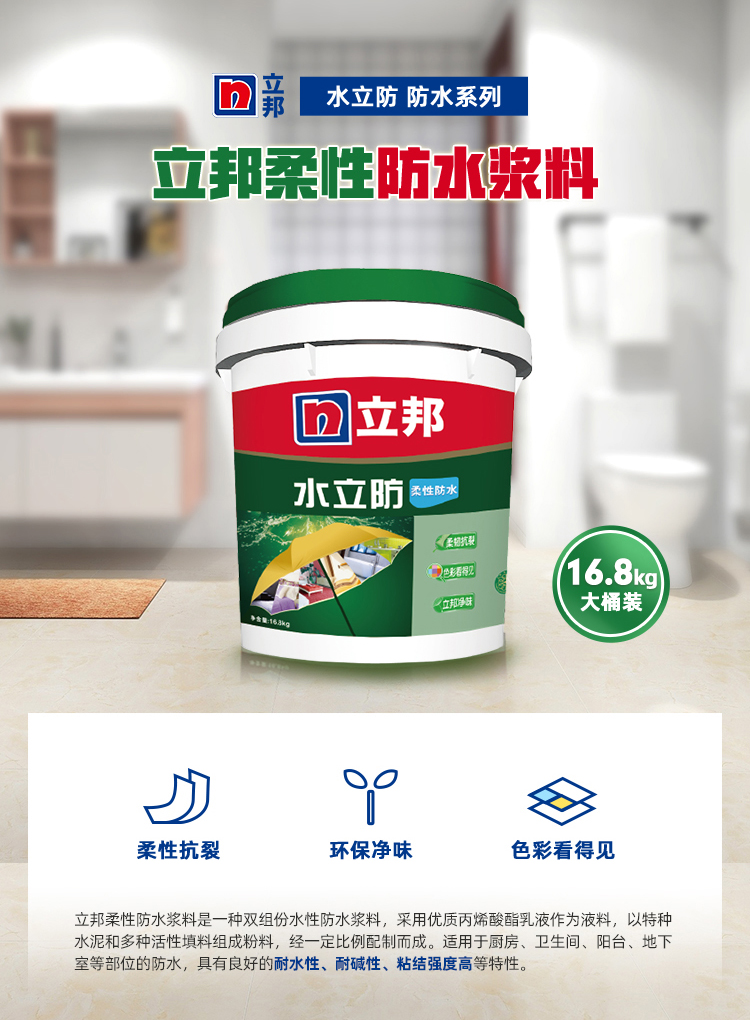 立邦柔性防水漿料是一種雙組份水性防水漿料,采用優(yōu)質(zhì)丙烯酸酯乳液作為液料,以特種水泥和多種活性填料組成粉料,經(jīng)一定比例配制而成。適用于廚房、衛(wèi)生間、陽臺、地下室等部位的防水,具有良好的耐水性、耐堿性、粘結(jié)強度高等特性。