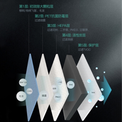 美的凈化器五層復合濾網(wǎng),去除10種以上污染物。