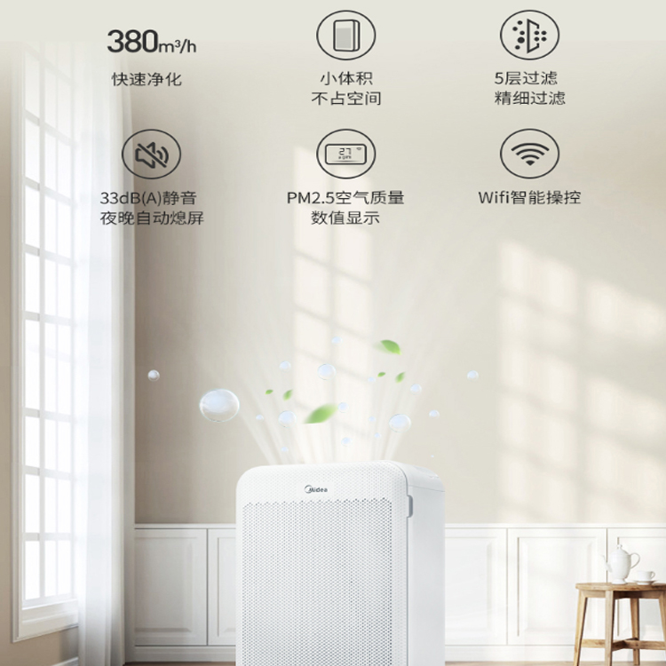 美的凈化器五分鐘可凈化12平方臥室,實現(xiàn)快速凈化。