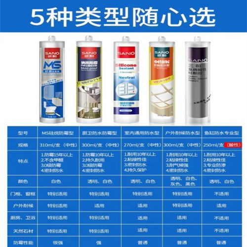 三和玻璃膠密封膠防水中性耐候硅酮膠防霉性強(qiáng)力免釘膠廚衛(wèi)結(jié)構(gòu)膠為單組分,中性室溫固化,酮肟型;優(yōu)良的耐氣候、耐老化性能;對大多數(shù)建材具有優(yōu)良的填縫粘接性;具有良好的耐高低溫性能。