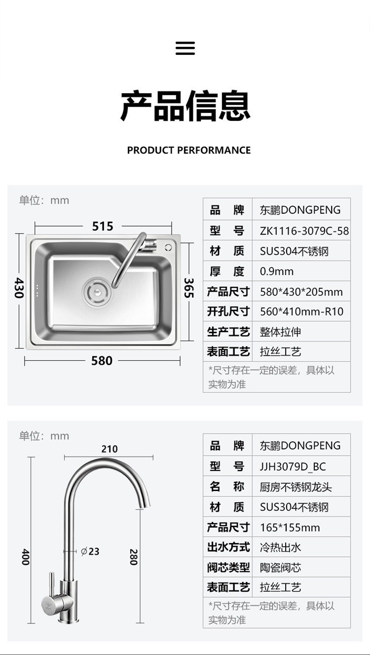 東鵬衛(wèi)?。―ONGPENG)304不銹鋼水槽單槽拉絲不銹鋼洗菜盆 帶水龍頭廚房水槽