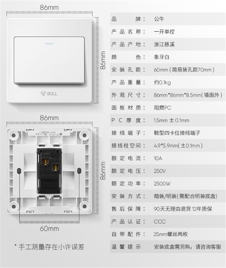 公牛開關(guān)插座面板一開單控開關(guān)86型墻壁插座墻面多孔
