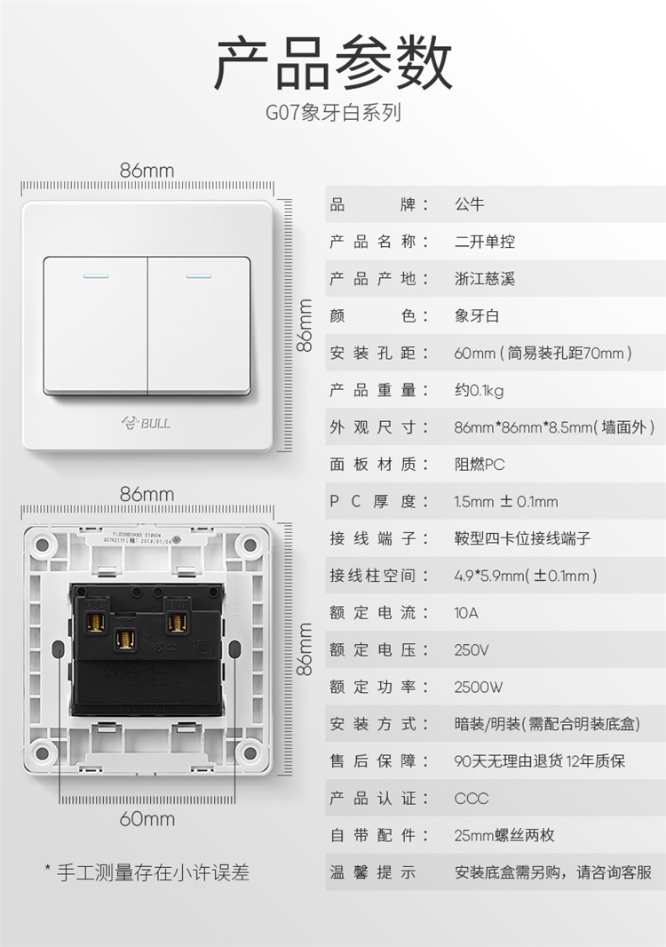 公牛開關(guān)插座面板二開單控開關(guān)86型墻壁插座墻面