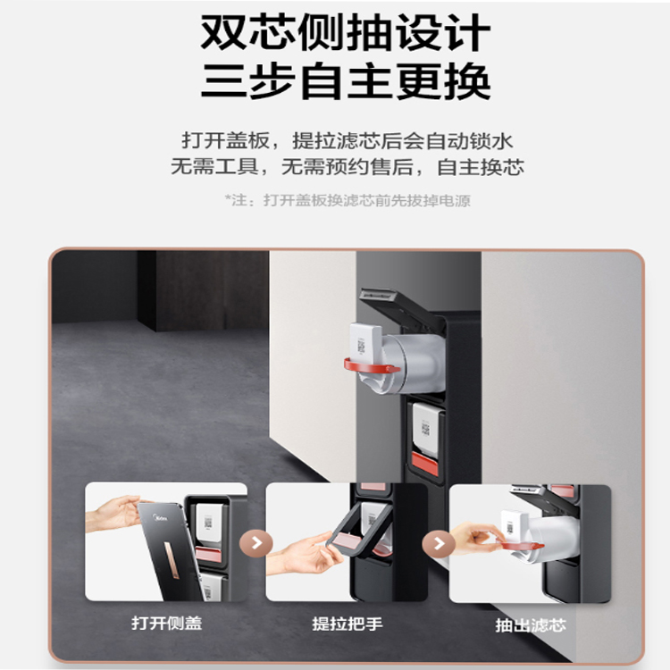 美的凈水器Fist系列-濾芯雙芯側(cè)抽設(shè)計(jì),三步自主更換。