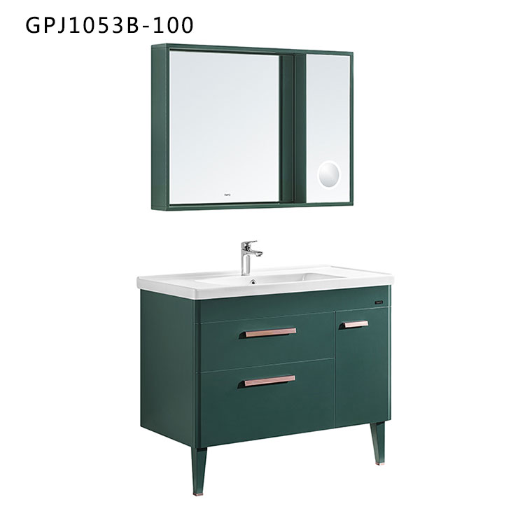材質(zhì):橡膠木+多層實木,顏色:黛綠色,主柜:1015x500x840mm,鏡柜:960x140x700mm,柜盆P-5063-100:1015*500*210mm。