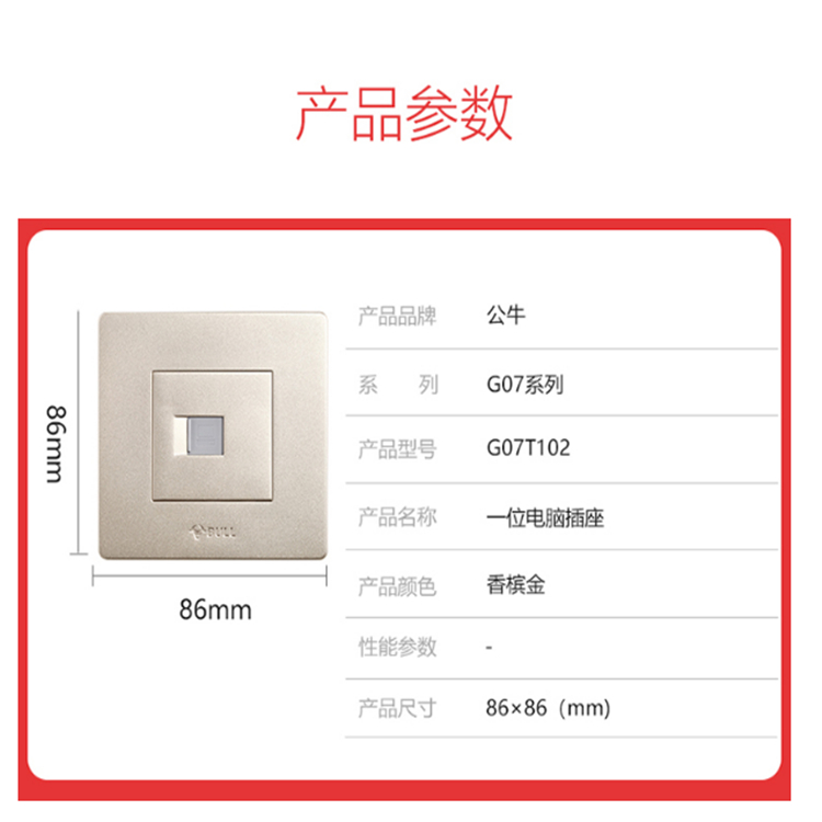 公牛(BULL) 開關(guān)插座 G07系列 一位電腦插座 86型面板G07T102(U6) 香檳金 暗裝