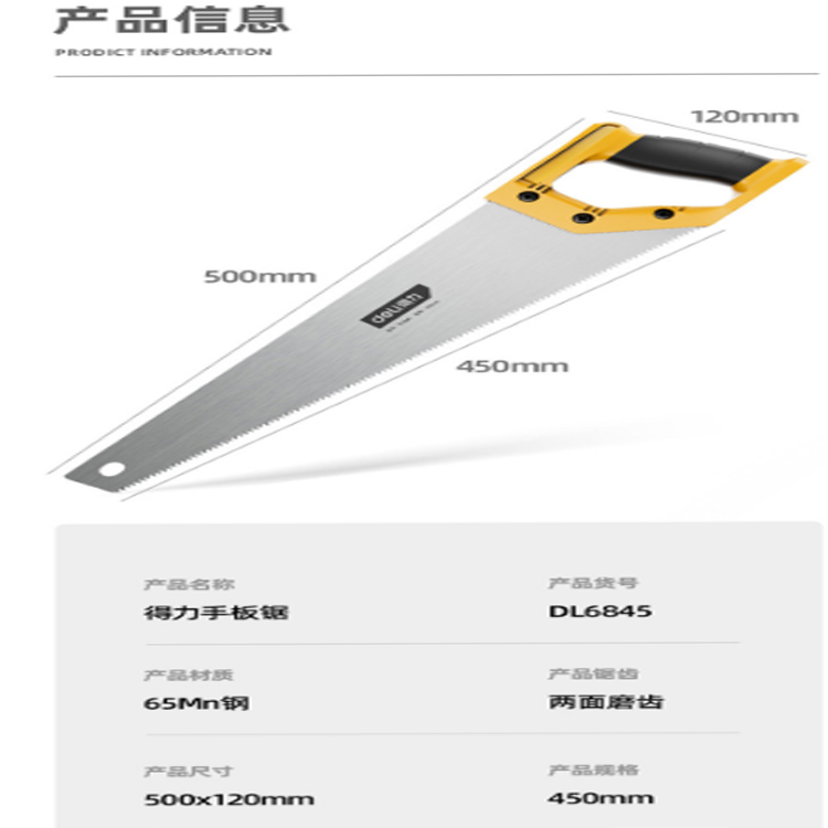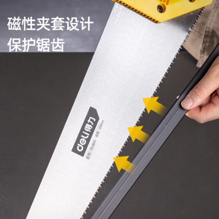 得力(deli) 手板鋸木工鋸子產(chǎn)品特點(diǎn) 65Mn鋼鋸片 兩面磨齒 防滑手柄 磁性夾套設(shè)計(jì)