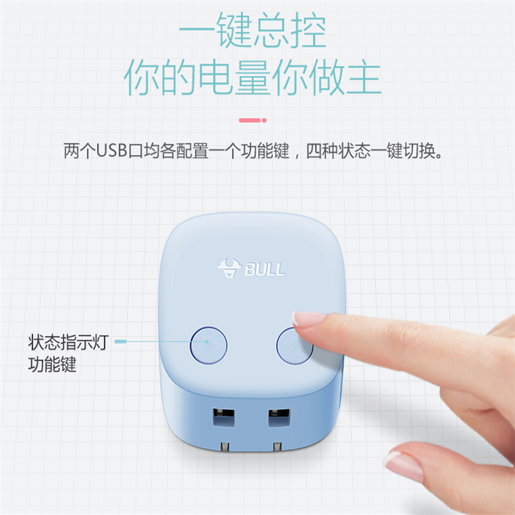 公牛自動(dòng)防過(guò)充USB充電器兩個(gè)USB口均各配置一個(gè)功能鍵,四種狀態(tài)一鍵切換,你